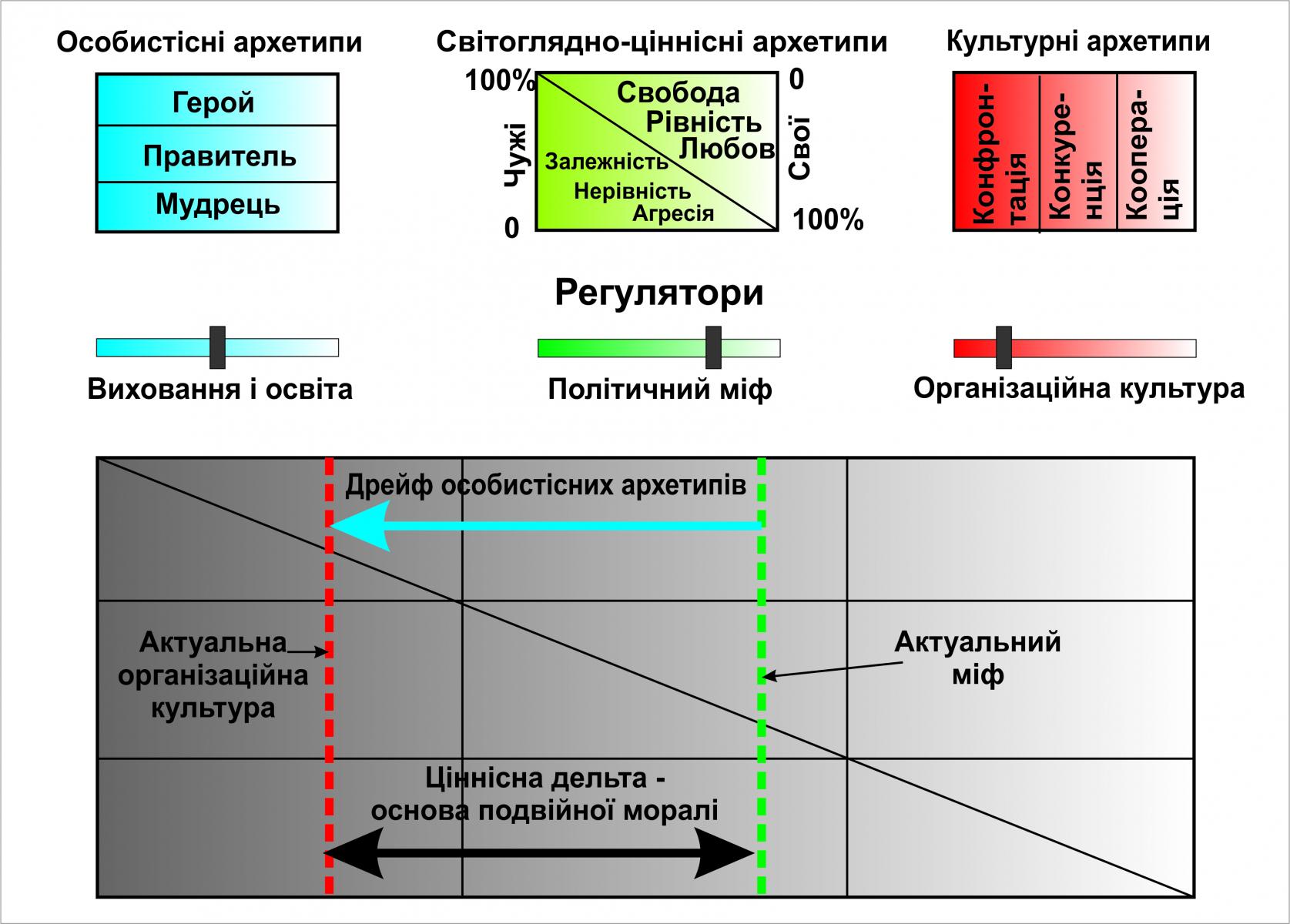 Схема 1. Інтегральна архетипна модель несвідомого соцієтальної психіки соціальних систем та основні регулятори для її налаштування.