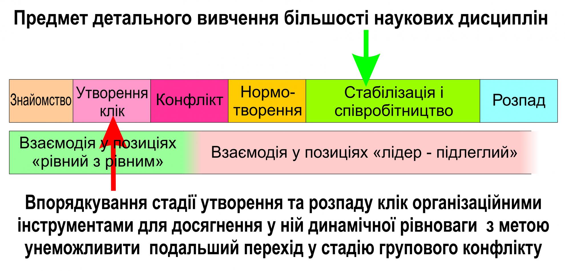 Більшість наукових дисциплін, що займаються дослідженням групової взаємодії людей та командоутворенням - від соціальної психології до менеджменту організацій, зосереджуються на вивченні і впорядкуванні взаємодії членів груп на стадії стабілізації та співробітництва у позиціях «лідер-підлеглий», що сформувалися після стадії конфлікту, перебіг якого автоматично активував культурний архетип конфронтації та зробив його домінуючим – таким, що визначає поточну організаційну культуру, глибинні цінності членів політичних організацій та вибір ними відповідних поведінкових схем і стратегій. Вважається, що процеси проявлення всіх попередніх стадій розвитку групи є невідворотними, нестабільними і скороминучими. Через це ці стадії вважаються непридатними для організації ефективної групової діяльності.