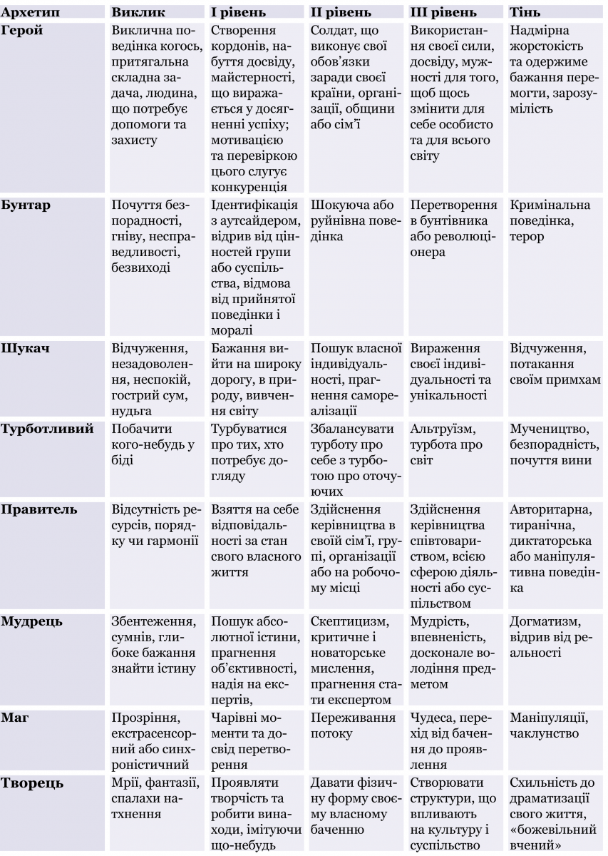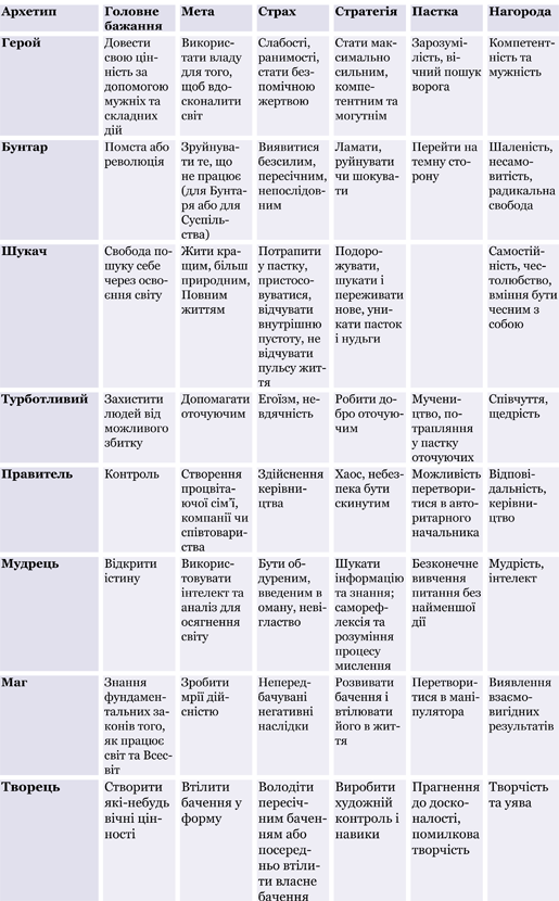 Скористаємося описом виділених американськими дослідниками Маргарет Марк і Керол Пірсон у книзі «Герой і Бунтар» основних дванадцяти особистісних архетипів, для спрощення виокремивши для нашої моделі лише деякі з них (таблиця 1).