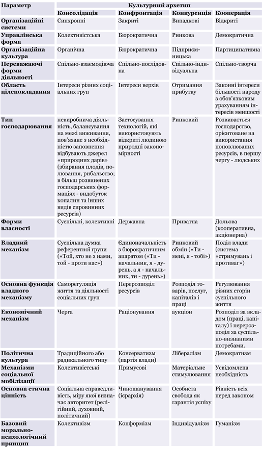 Ще одним із факторів, які в умовах суспільно-політичних систем впливають на напрямок проявлення перелічених особистісних архетипів, є архетипи культурні. Скористаємося їх класифікацією , що приведена у книзі під редакцією Т.Ю. Базарова і Б.Л. Єрьоміна «Управління персоналом», у якій автори виділяють культуру консолідації, культуру конфронтації, культуру конкуренції та культуру кооперації (таблиця 3). Співвідношення та міра активації культурних архетипів у даному суспільстві у своїй сукупності обумовлює тип його організаційної культури.