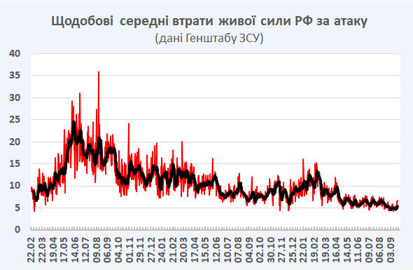 12:05 За минулий тиждень, за зведеннями Генштабу ЗСУ, було відбито 1301 російську атаку (позаминулого тижня – 1318), при цьому знищено 7000 російських військових (позаминулого – 6460): у середньому 5,4 за атаку (позаминулого – 4,9).