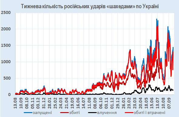 За минулі сім днів було збито чи локаційно втрачено 1304 із 1448 запущених по Україні БпЛА (разом – 90%).