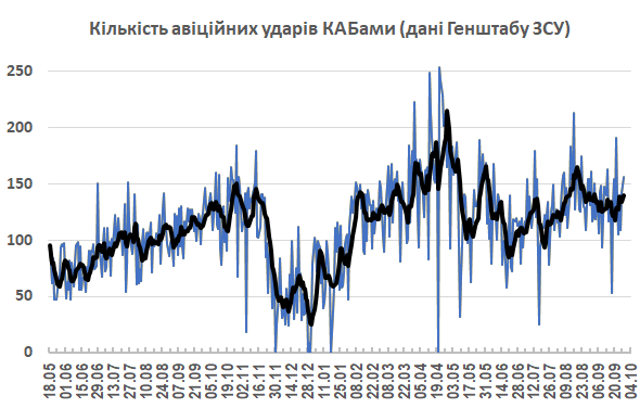 12:45 Протягом минулого тижня російська армія застосувала проти України 975 корегованих авіаційних бомб, що суттєво більше, ніж попереднього тижня (було 823), випливає зі щоденних повідомлень Генштабу ЗСУ.