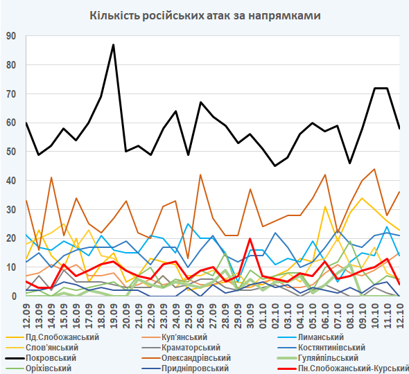 09:05 Інтенсивність російських атак на різних напрямках (за даними зведень Генерального штабу ЗСУ):
