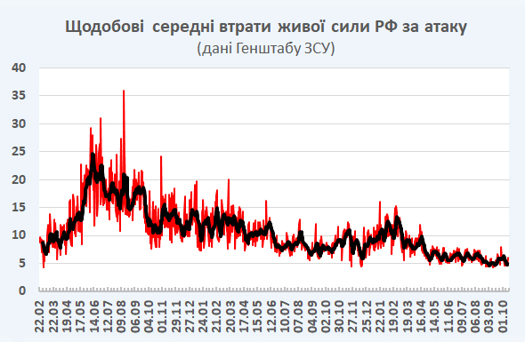 12:05 За минулий тиждень, за зведеннями Генштабу ЗСУ, було відбито 1523 російські атаки (позаминулого тижня – 1226), при цьому знищено 7560 російських військових (позаминулого – 6740): у середньому 5,0 за атаку (позаминулого – 5,6).