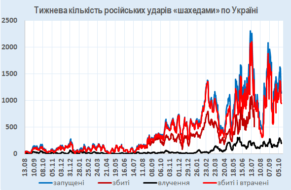 За минулі сім днів було збито чи локаційно втрачено 941 із 1134 запущених по Україні БпЛА (разом – 83%).
