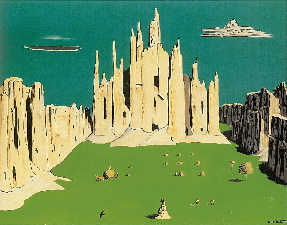 У 1957 році міланська галерея Apollinaire організувала конкурс для письменників-аматорів у живописі: завданням було створити картину, натхненну площею Дуомо в Мілані. Серед учасників були Еудженіо Монтале, Оріо Верґані та Діно Буццаті. Хоч виставку так і не вдалося реалізувати, саме тоді народилася картина, яку можна вважати своєрідним автопортретом письменника: La Piazza del Duomo di Milano. На ній фасад собору й прилегла площа перетворюються на альпійський пейзаж. Білий мармур стає скелею, шпилі – піками, вікна – печерами. Навколишні будівлі трансформуються у скельні масиви, а сама площа – у долину, де селяни заготовляють сіно. Це не просто художній експеримент: у картині Мілан зливається з Доломітами, так само як у самому Діно Буццаті перепліталися любов до міста й до природи, журналістика й література, живопис і письмо, буденність і фантазія.