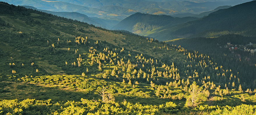 Коли подивитися з однієї гори на похилу стіну іншої, тоді вони досить близько одна від іншої, а між ними груба складка, то перше, що означує протилежний схил, – це плями криволісся. Зрозуміло, що йдеться про карпатську субальпіку, те, що вище лінії лісів. Колір тих плям дуже залежить від загального освітлення. Вони можуть бути яснішими від полонин, можуть бути темнішими – і все у межах зеленого. А можуть бути чорними. Або рожевими. Або фіолетовими. Кілька добрих художників уміли їх малювати на реалістичних картинах тими нереальними відтінками, які є не правдоподібними, а достовірними у конкретну мить співбуття зі світлом.