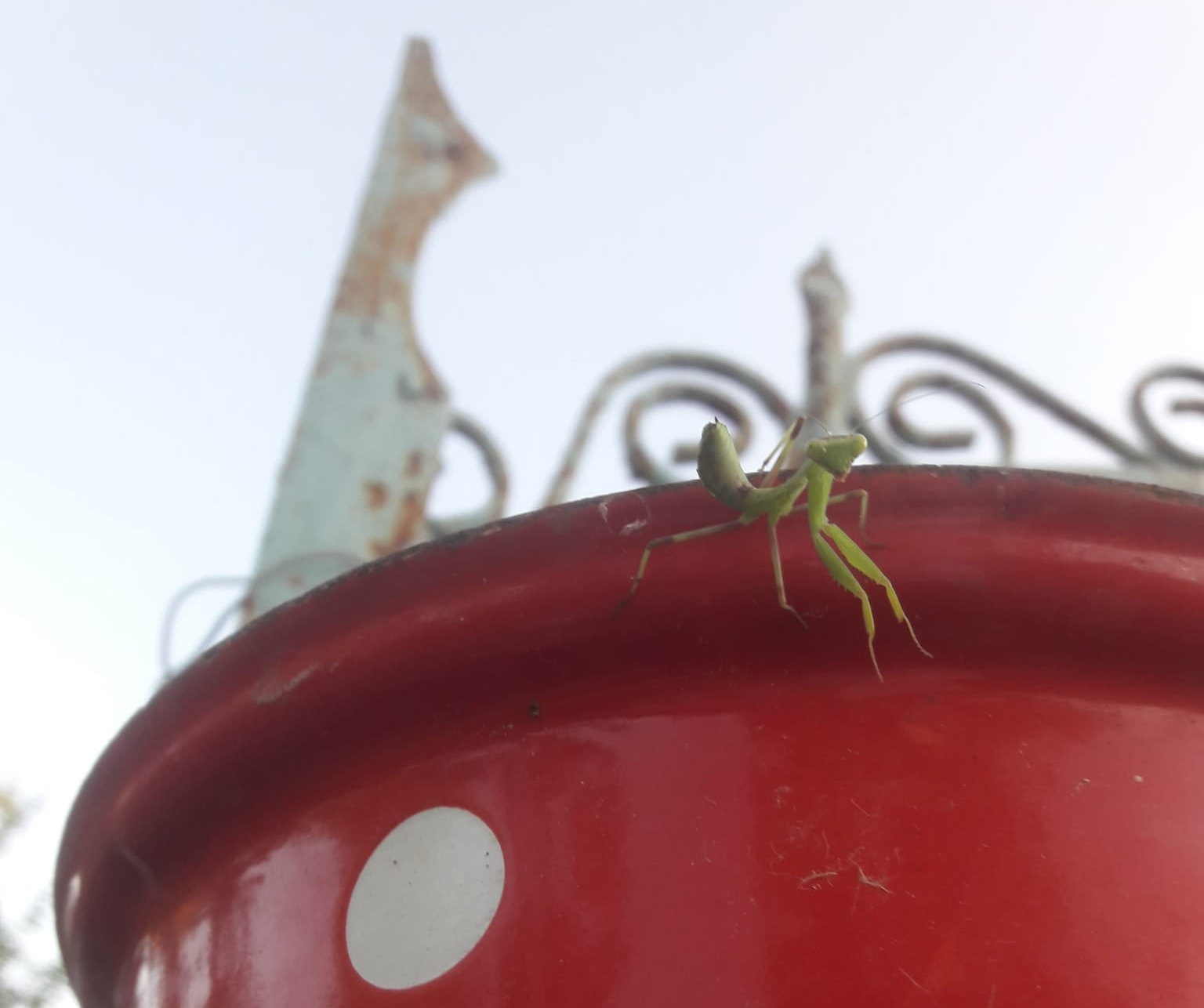 І того ж таки вечора ще одна зустріч. На каструльці, яка на паркані в мене біля фіртки стоїть, аби пташкам воду пити, побачив богомольця. Ну, бо вже й не богомольчика, якими були на початку, але ще й не дорослого…