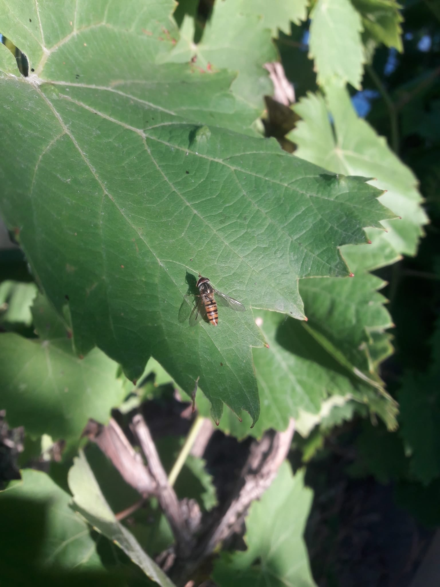 Смугасті мухи, яких спостерігав на винограді, належать до родини повисюхових, або ж дзюрчалкових мух. Радше за все. Сфотографував і зафільмував днями схожу, теж зі смугастим черевцем і теж на листку винограду, тільки більшу трохи. І надіслав Євгенію Халаїму, ентомологу знайомому, аби запитати. Сфотографована точно з дзюрчалкових – він навіть вид назвав ймовірний, але меншими бути не могли – дорослі мухи після виходу з лялечки вже не ростуть, сказав. Тому ті, отже, иншого виду були. Що зрештою й не дивно, адже їх тільки в межах України близько п’ятисот… І до речі так – дзюрчалкові мухи одні з найкращих запилювачів!