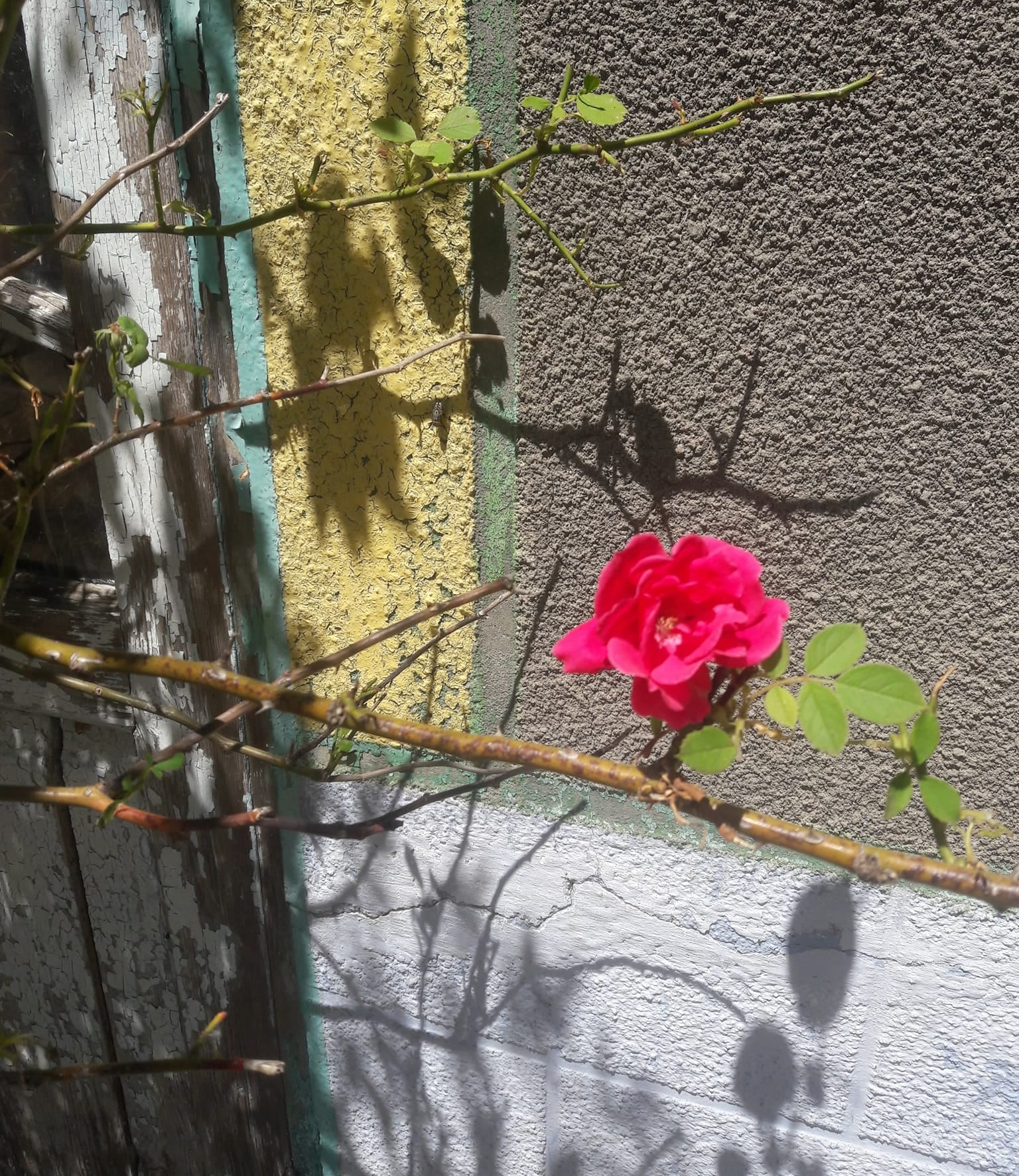 Друге – там, де вода у овець (бо вони загалом на кількох обійстях поспіль замешкують, електропастухом огороджені), перед хатою великий кущ троянди росте. Не знаю напевне, як вона зветься, але це та властиво, яка кущем. І на ній кілька квіток червоних. Не багато – також можливо через приморозки весняні абощо – але є ціле скупчення в одному місці, й вони вже прив’ялі трішки, вже їм час виходить, а одна окремо й свіжа. І супроти стіни. І з того, мабуть, що був заморився і стоншився, Квітка та глибоко очі ввібрала…