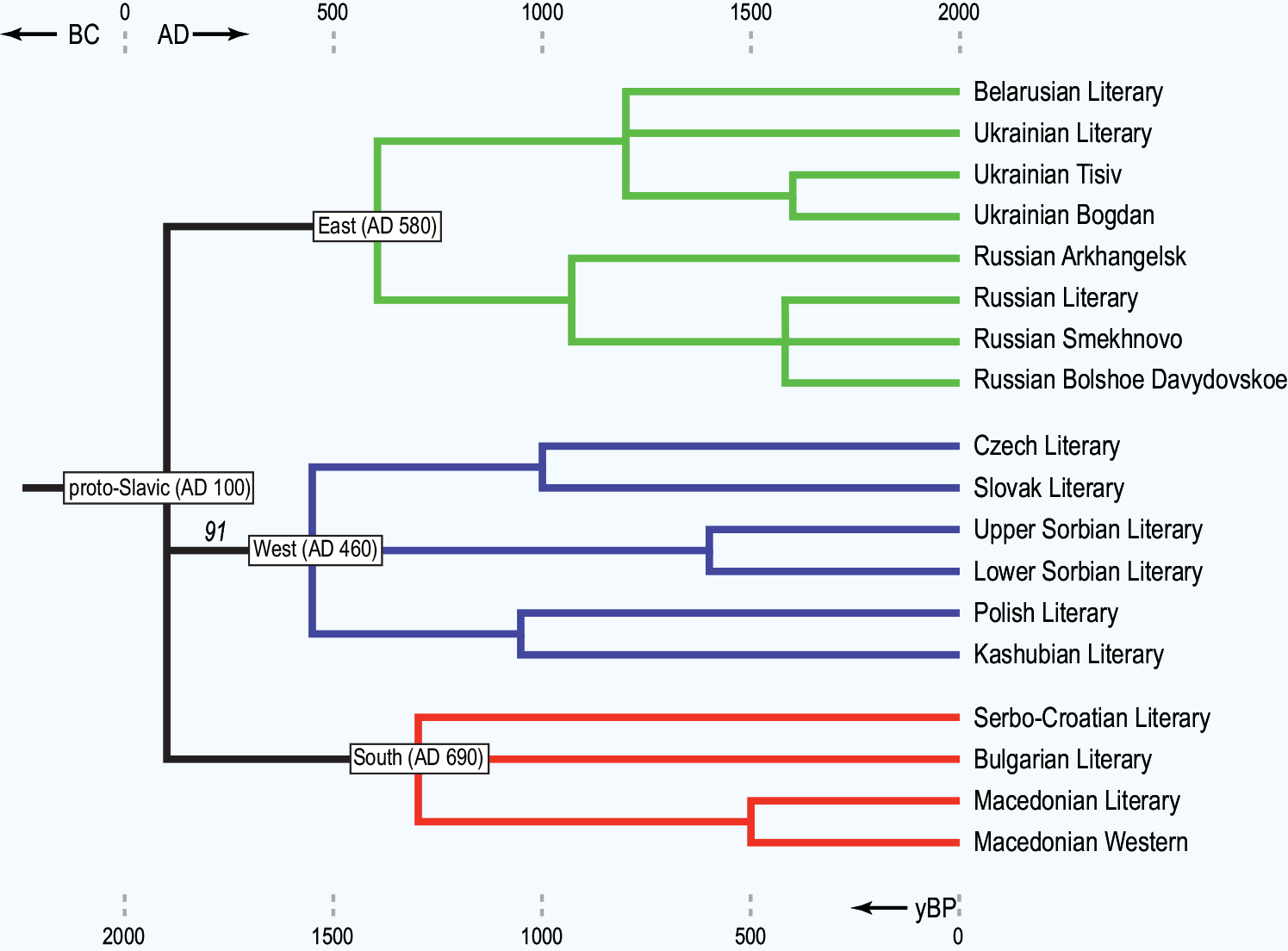 Але східна група на цій генеалогічній схемі розбивається на кілька кластерів: властиво російську та російсько-білоруську, яка, своєю чергою, диференціюється на властиво білоруську на білорусько-російську, в якій (тримаючи в пам'яті попередню дендрограму) знову впізнаємо схему формування трьох народів сходу Славії, а також мапу ізоглос Геннінґа Андерсена.