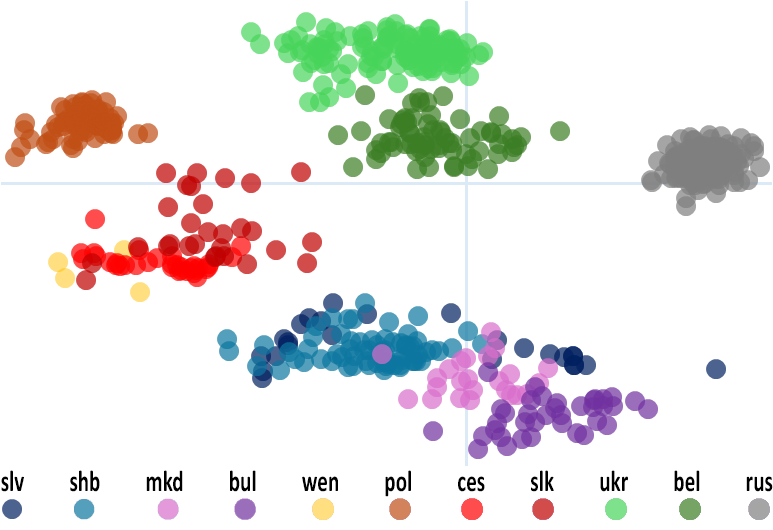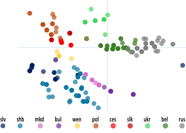 ⁴³ Відоме значення середньої похибки дає можливість статистичним бутстрепом (тобто генеруванням кількох сотень мутацій базової матриці з випадковим відхиленням в межах похибки) оцінити – через індекс Жаккара – стабільність отриманих кластерів: нестабільні (а саме диференціація українсько-білоруських, західно- і моравсько-чеських, західноболгарських і македонських, сербохорватських, а також словенських і нештокавсько-хорватських) відзначені на діаграмі.