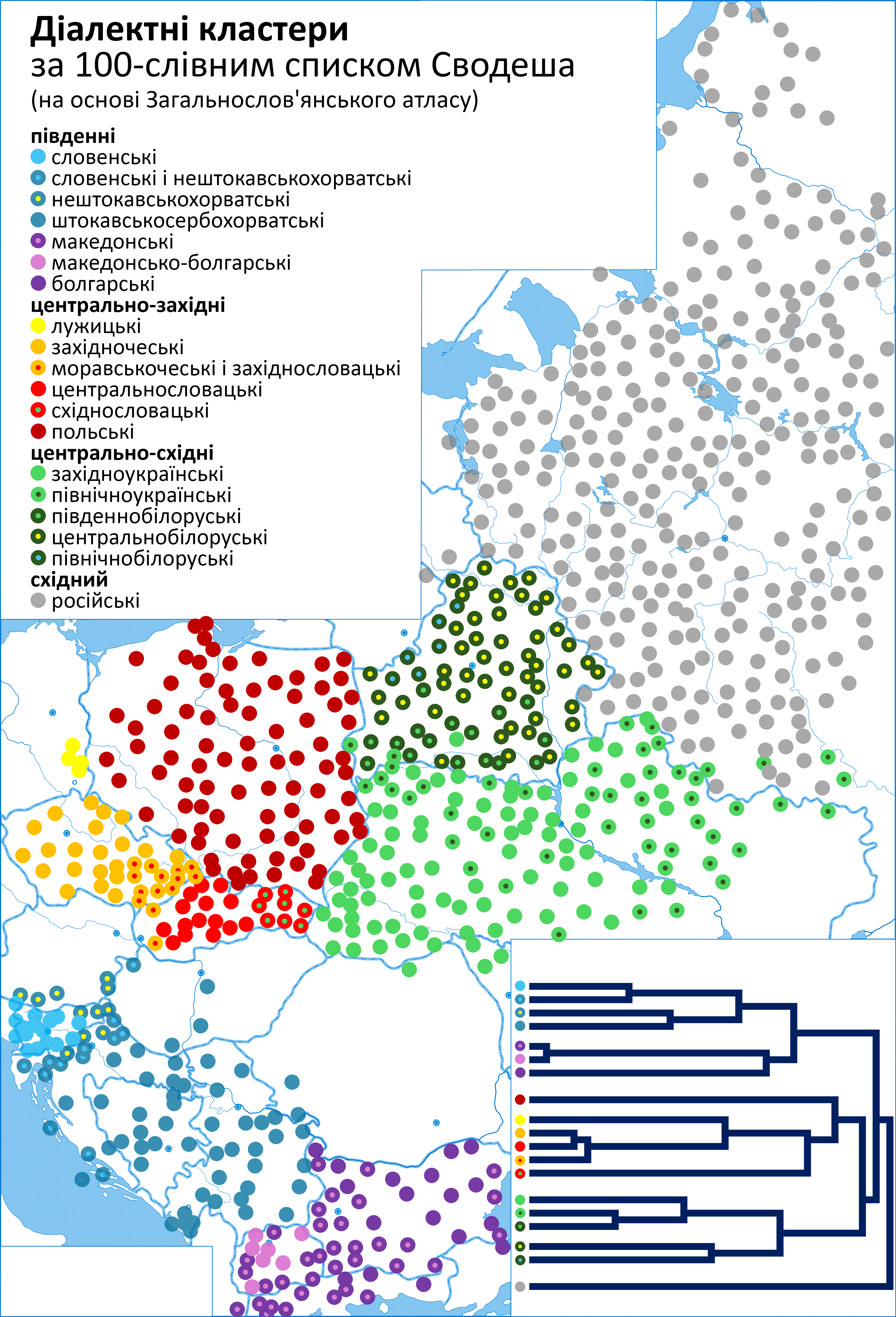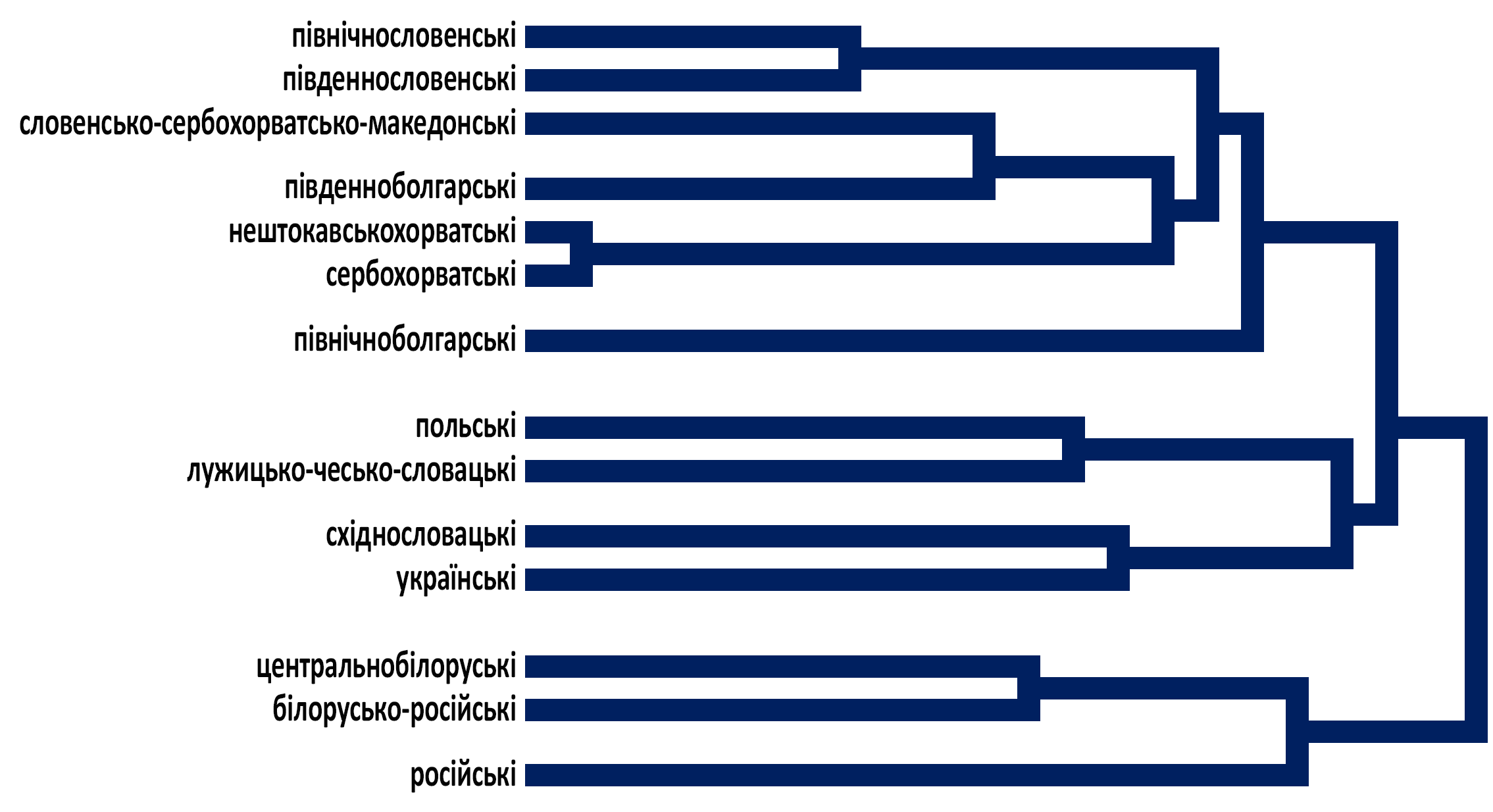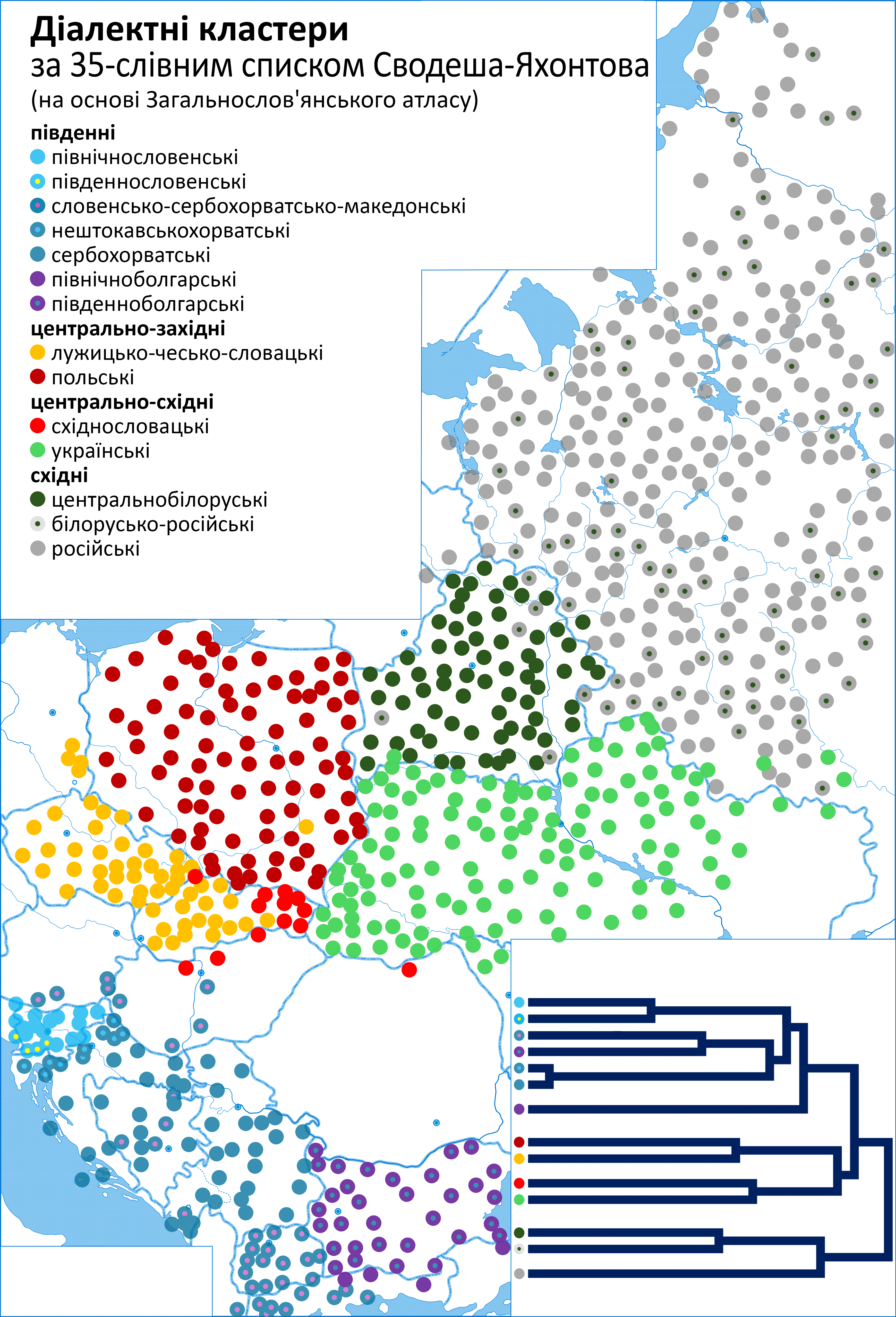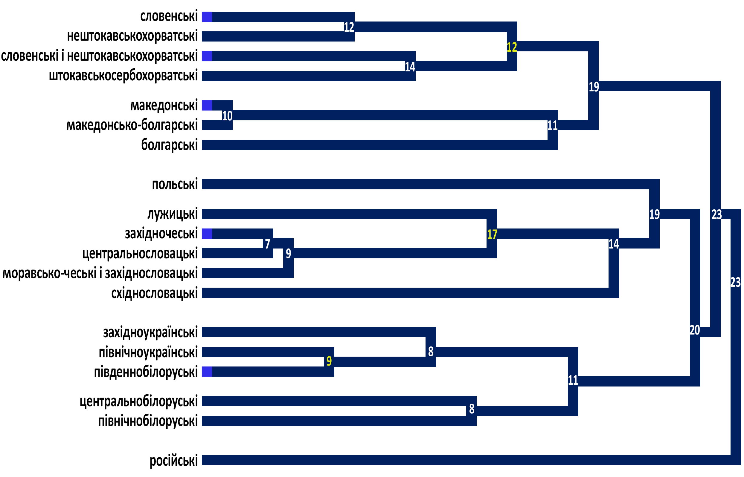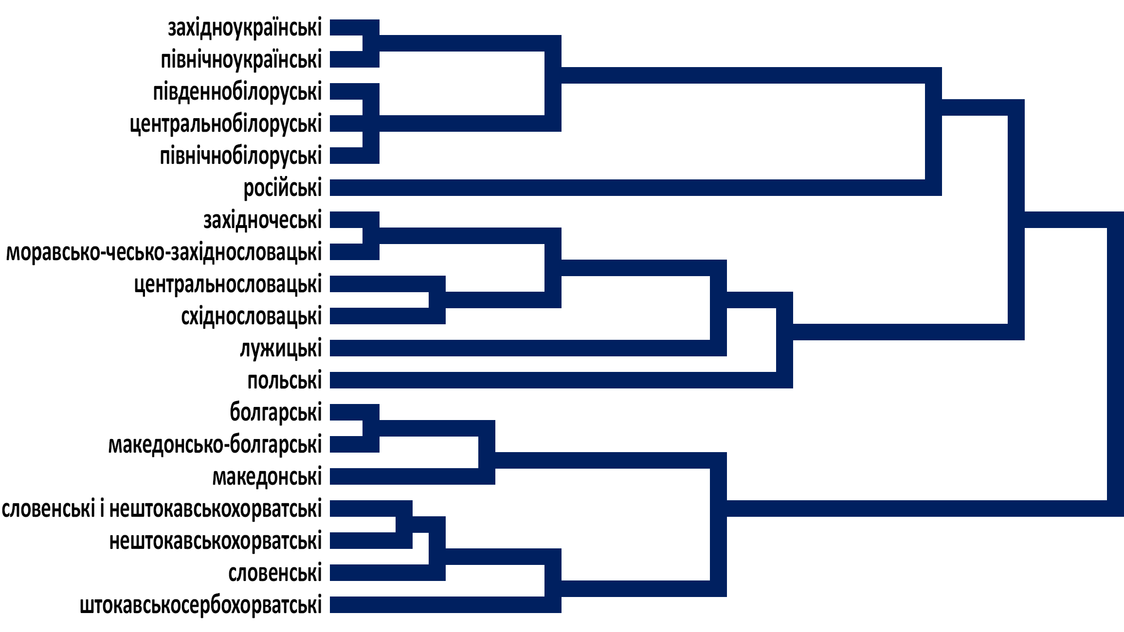 На початках праслов'янська діалектична єдність почала диференціюватися на три кластери: південну, західну (а радше центральну) та східну групи, що відповідає віддавна усталеній схемі. Нетиповим є склад двох останніх груп (південна група передбачувано ділиться на болгарсько-македонську та словено-сербохорватську підгрупи): східна група включає лиш російські діалекти, натомість білорусько-українська, яка традиційно включається разом з російською в східнослов'янську групу праслов'янських діалектів, входить разом із західнослов'янськими діалектними групами в центральнослов'янську, утворюючи там східну підгрупу. А далі ця підгрупа ділиться на два менші кластери: властиво білоруський і українсько-білоруський, який, своєю чергою, ділиться на властиво український та, знову ж таки, білорусько-український – в якій впізнаємо галицько-подільську та києво-поліську групи діалектів історичної фонології української та білоруської мов Юрія Шевельова.