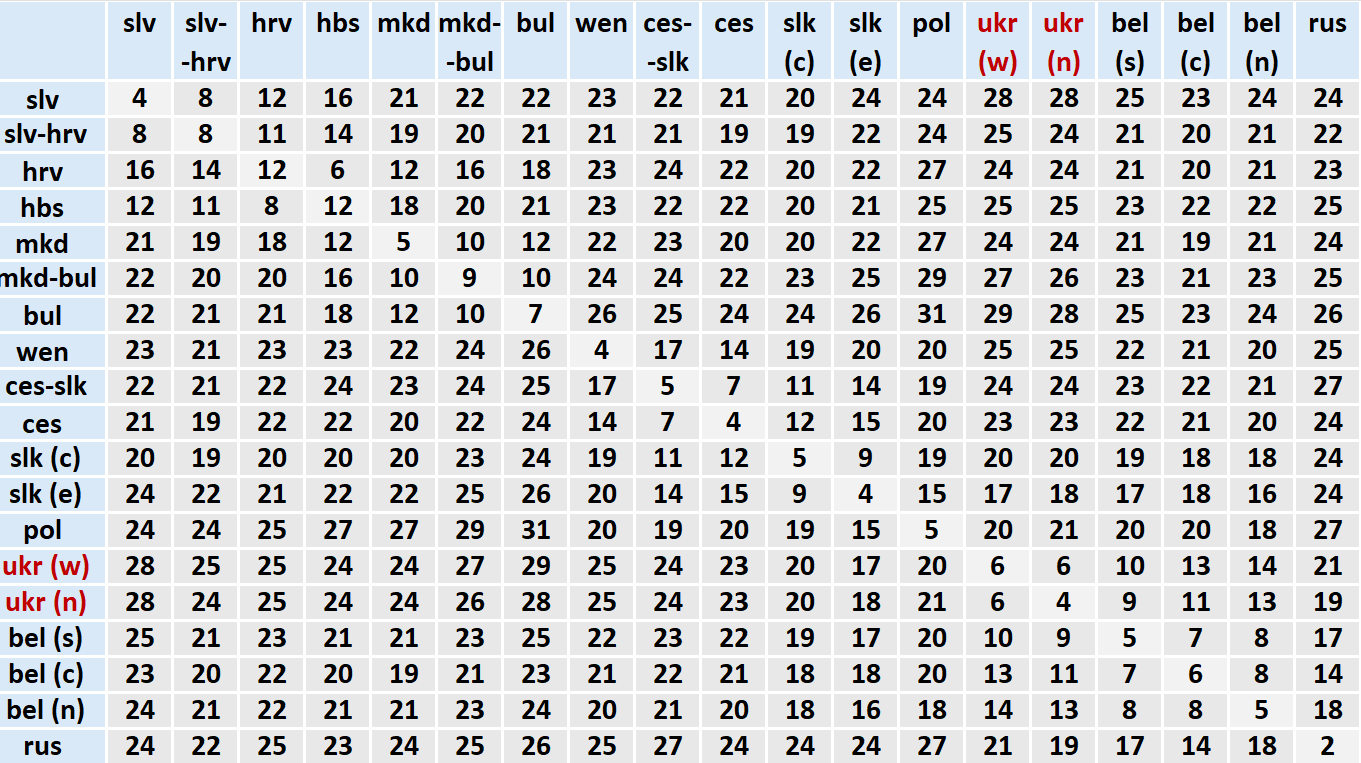 Їхній сучасний географічний розподіл (не факт, що таким він був у праслов'янську епоху) показано на мапі, а середні віддалі між ними – в матричній таблиці⁴³.
