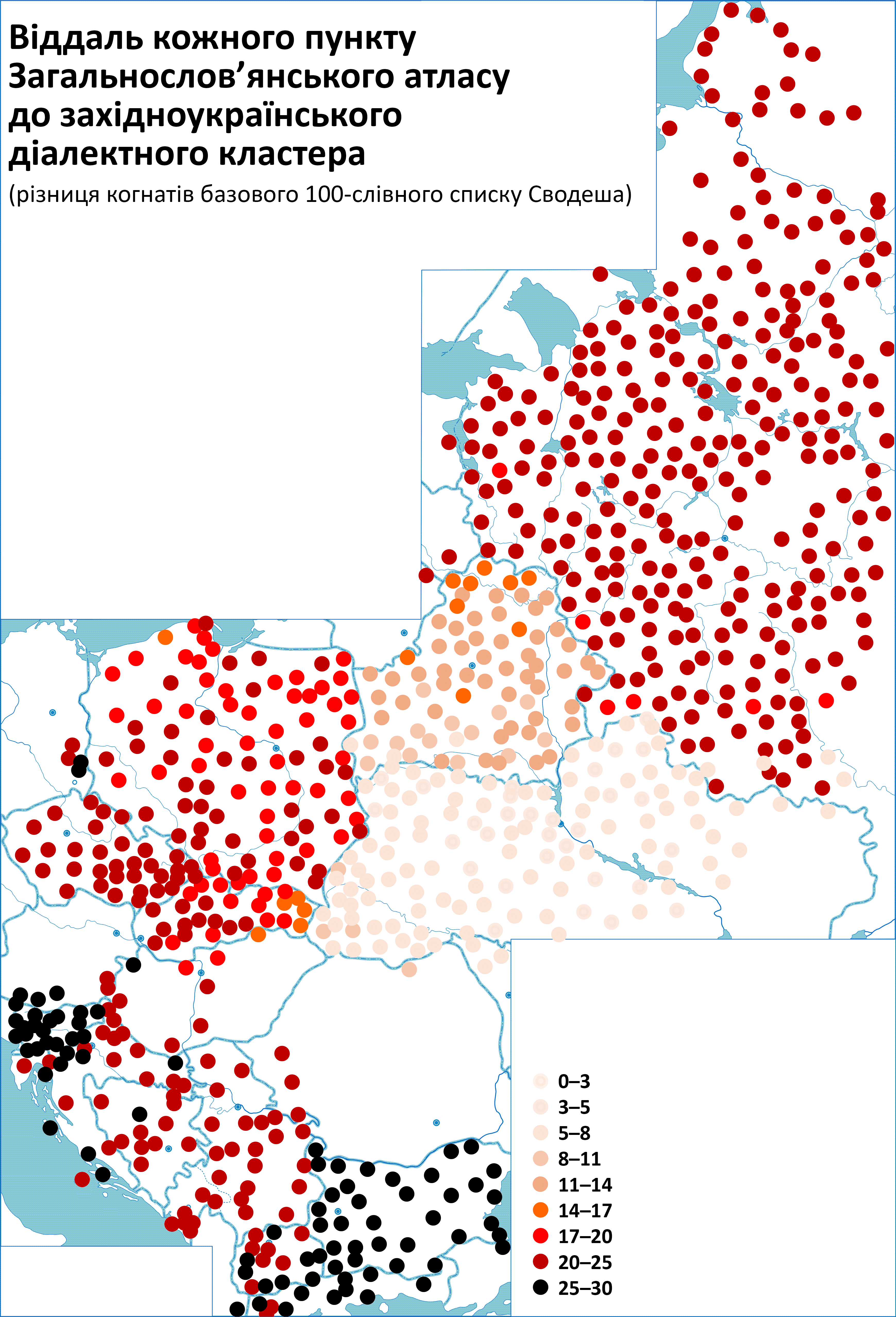 Але поки цього нема, можна спробувати використати те, що є. А є матеріали Загальнослов'янського лінгвістичного атласу (OLA) – грандіозного проєкту, що почався за рішенням IV Міжнародного з’їзду славістів в 1958 році і ще не завершився. Опитування охоплювали 834 пункти (мовці 13 слов'янських мов) і тривали до 1990 року. Квестіонар атласу включав 3454 питання – серед них, власне, були 98 лексем²² зі 100-слівного списку Сводеша²³.