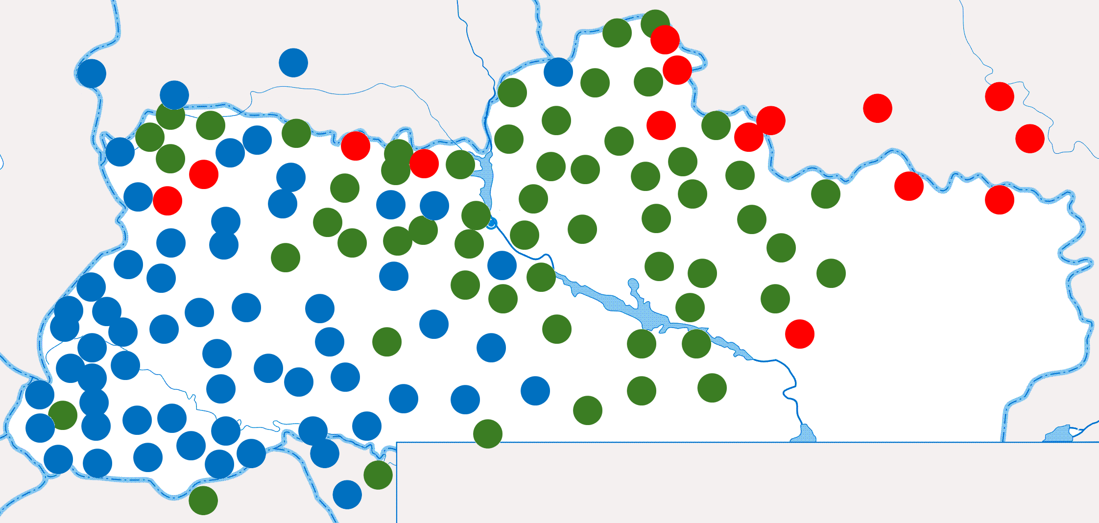 Синім позначено пункти, де ближчою за російську є і східно-словацька, і польська діалектні групи, зеленим – східно-словацька, червоним – де ближчою є російська діалектна група.