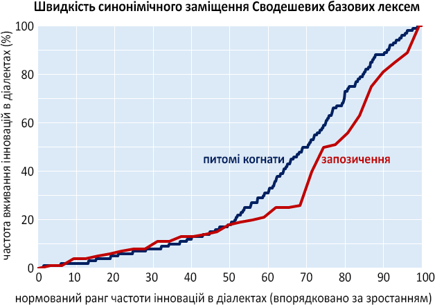 Коли таку саму процедуру провести для визначення часової траєкторії витіснення старих лексем запозиченнями (попередня була для питомих праслов'янських когнатів), то побачимо сильніше виражену асиметрію отриманої S-подібної кривої: довший (до сьомого дециля всього періоду) перший повільний етап входження запозичення в обіг і, відповідно, прискорення на етапі остаточного витіснення (до 20% збільшення частоти за дециль): це може пояснити зафіксовану дослідженнями деформацію глоттохронології запозиченнями (щоб її усунути, запозичення в глоттохронологічних оцінках не враховуються; натомість отримані траєкторії вказують, що і синоніми, і запозичення варто – з корекцією на S-подібну форму еволюції витіснення – включати в розрахунок).