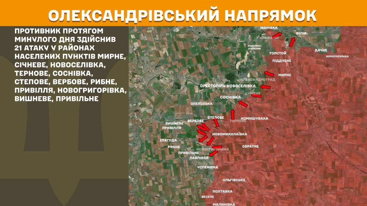 На Олександрівському напрямку противник протягом минулого дня здійснив 21 атаку у районах населених пунктів Мирне, Січневе, Новоселівка, Тернове, Соснівка, Степове, Вербове, Рибне, Привілля, Новогригорівка, Вишневе, Привільне.