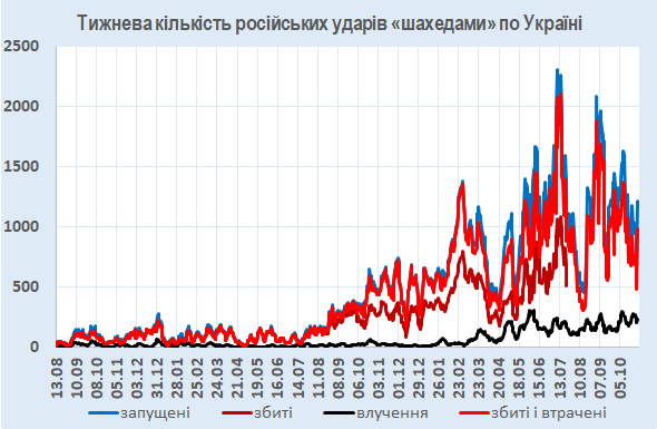 За минулі сім днів було збито чи локаційно втрачено 983 із 1208 запущених по Україні БпЛА (разом – 81%).