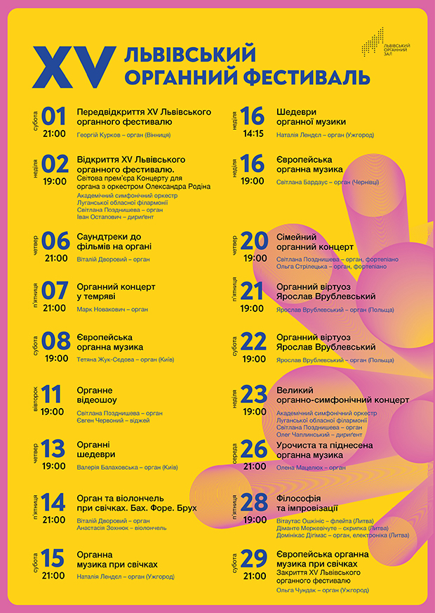 Протягом місяця в межах ювілейного фестивалю у Львівському органному залі відбудеться 18 концертів. У програмі широкий спектр подій: від великих симфонічних прем’єр - до поєднання звуків органа з електронною музикою.