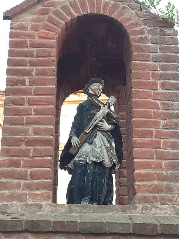 Скульптура святого Яна з Непомука біля костела Преображення Господнього в Добромилі (робота школи Йогана Ґеорґа Пінзеля). Світлина Ігоря Набитовича