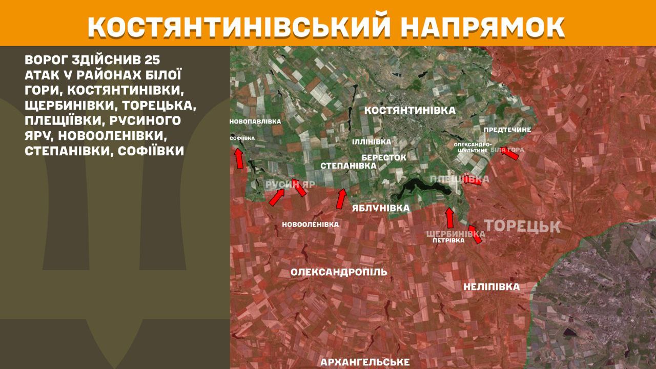 На Костянтинівському напрямку ворог здійснив 25 атак у районах Білої Гори, Костянтинівки, Щербинівки, Торецька, Плещіївки, Русиного Яру, Новооленівки, Степанівки, Софіївки.