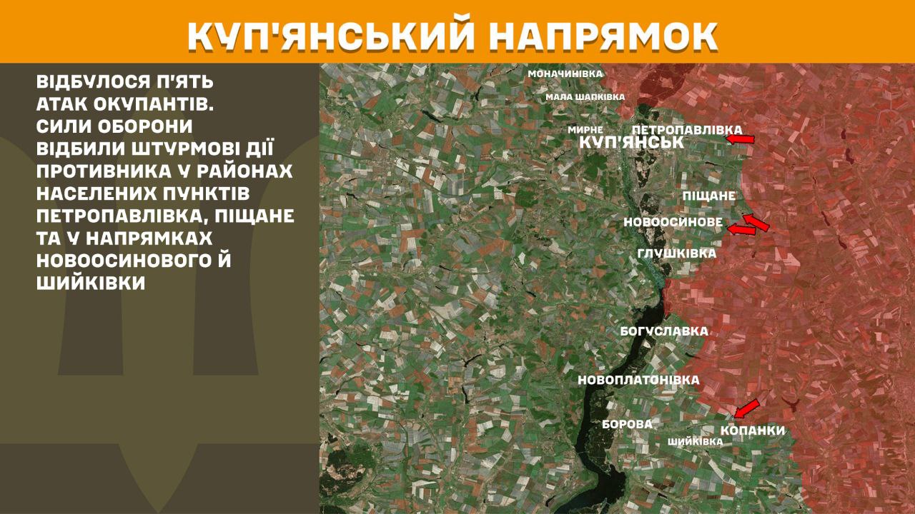 На Куп’янському напрямку за добу відбулося п’ять атак окупантів. Сили оборони відбили штурмові дії противника у районах населених пунктів Петропавлівка, Піщане та у напрямках Новоосинового й Шийківки.