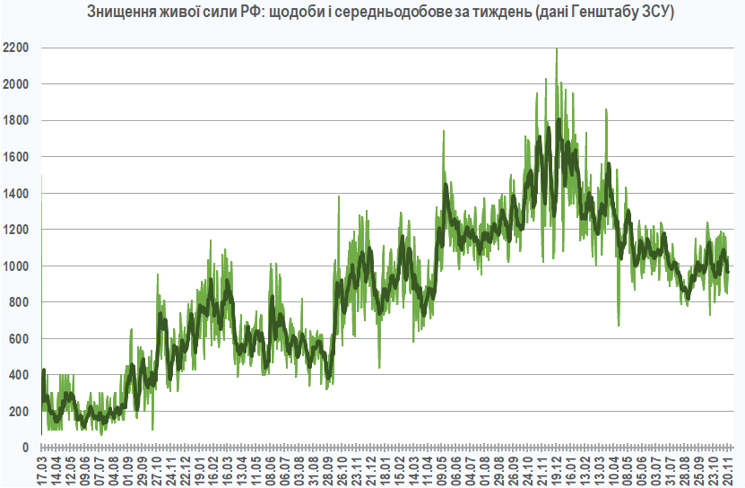 Противник завдав по позиціях українських підрозділів та населених пунктах 62 авіаційних ударів, скинувши при цьому 145 керованих бомб. Крім цього, здійснив 3674 обстріли, з них 53 — із реактивних систем залпового вогню, та залучив для ураження 3470 дронів-камікадзе.