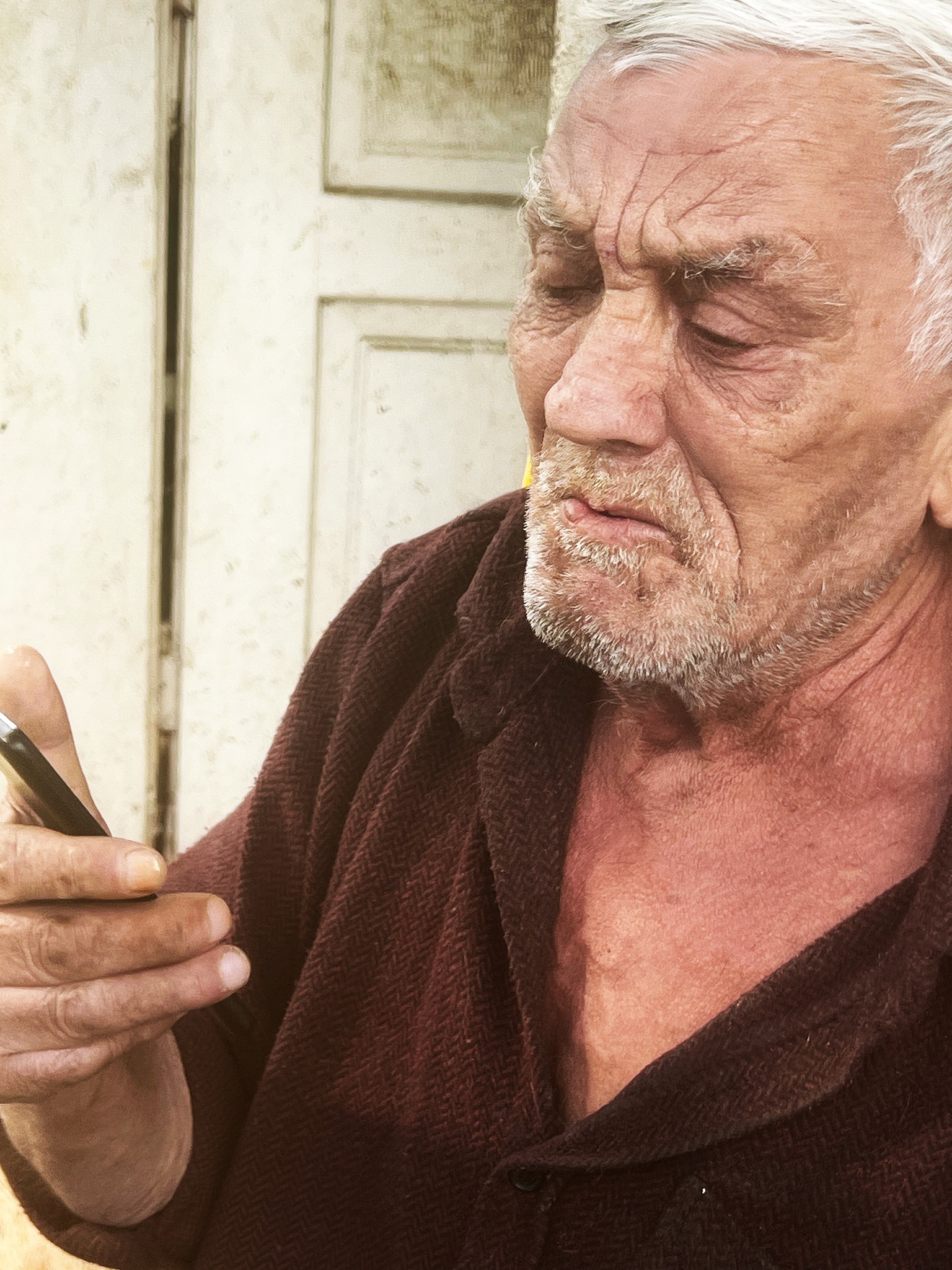 Потім заходить красива дівчина зі словами «Чому ви не відповідаєте? Люба не може додзвонитись!». Виявляється, він мав двох дітей, син змарнувався і помер, дочка в Америці. Обоє мають вайбер, але він не вміє приймати відеодзвінки. Дівчина пробує зателефонувати Любі, але в Америці ранній ранок. Як тільки вона відходить, бо пора до Франківська, приходить її бабця з теплою їжею, розповідає, що село тепер схоже на геріатричний санаторій, молодь і молодість його покинули, внуки приїздять на годинку, старі їм дорогі, але не цікаві, і це природньо. Раптом починається відеосеанс: хтось зʼявляється на відеодзвінку і лагідно відповідає з вайбера в руці «тату, я так рада вас бачити! я щаслива, що ви є! я хочу бути поряд! я вас дуже люблю! чуєте? мені так не вистачає батьківського тепла і слова! я на вас не тримаю жалю, хоча ми так давно не бачились!». Я скеровую смартфон від його вуха до лиця. «Який же ви красивий, тату!». Вони обоє плачуть, ми на межі, її голос стискає. У неї дома ще всі сплять, тому вона показує татові знимки родини, натомість, щоб набачитись, просить його не відводити камеру, яка періодично тікає до вуха.