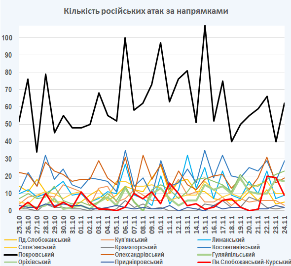 09:05 Інтенсивність російських атак на різних напрямках (за даними зведень Генерального штабу ЗСУ):
