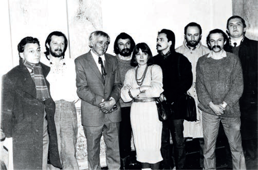 Учасники товариства «Шлях» на відкритті виставки Опанаса Заливахи (Львівський музей етнографії і художнього промислу, 1988 р.). Зліва направо: В. Кауфман, Ю. Бойко, О. Заливаха, П. Гуменюк, О. Бойко, Ю. Кох, М. Крицький, А. Гуменюк, Ю. Юркевич. Львів, 1988 р.