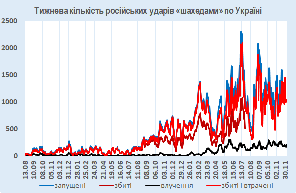 За минулі сім днів було збито чи локаційно втрачено 1041 із 1255 запущених по Україні БпЛА (разом – 83%).