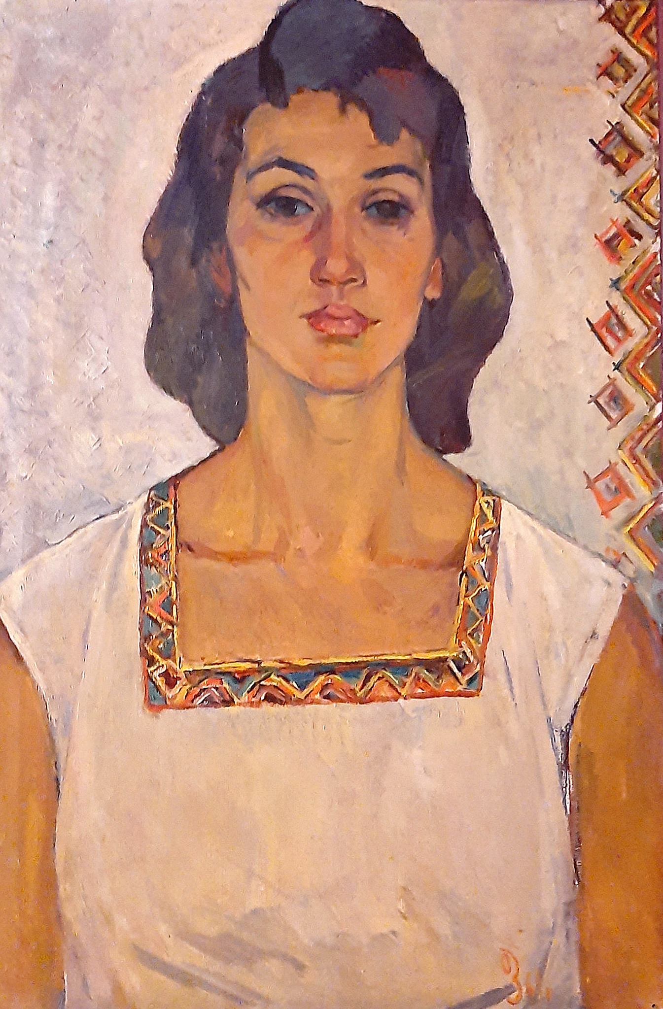 У листах Опанаса Заливахи до Олени Антонів, починаючи з 1957 р., знаходимо немало згадок про те, що він малював її портрет. Вперше це було в Косові, куди приїхав на практику з друзями і там познайомився з нею. Вона стала немовби тою провідною зіркою, яка вела його до рідної землі й до відновлення українства в собі. Протягом усього життя він зберіг особливе, благоговійне ставлення до неї, то й не дивно, що часто звертався до спроб зобразити її на полотні. Якщо судити із згадок про це у листах, то розуміємо, що не всі такі спроби до нас дійшли. Але є два портрети, на які варто звернути увагу, бо різниця між ними неймовірна. На одному з них, який датується 1961 роком, Оленка молода, в білому платті зі скромною вишивкою. Фрагмент такої ж вишивки художник дав по правій стороні обрамлення портрета, напевно, бажаючи цим підкреслити її (Оленки) глибоку українськість. Саме такою він побачив її тоді в Косові.
