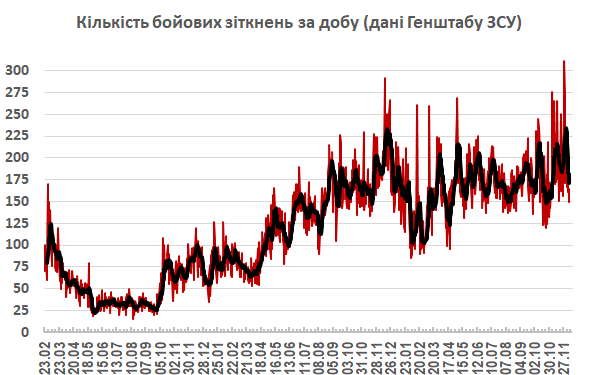Вчора противник завдав по позиціях українських підрозділів та населених пунктах одного ракетного та 80 авіаційних ударів, застосував одну ракету й скинув 208 керованих бомб. Крім цього, було залучено для ураження 6254 дронів-камікадзе та здійснено 4128 обстрілів позицій наших військ і населених пунктів, з яких 88 – із реактивних систем залпового вогню.