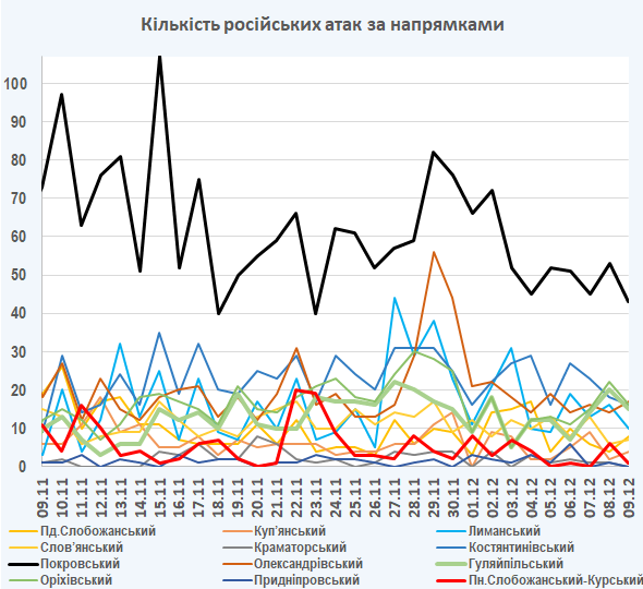 09:05 Інтенсивність російських атак на різних напрямках (за даними зведень Генерального штабу ЗСУ):