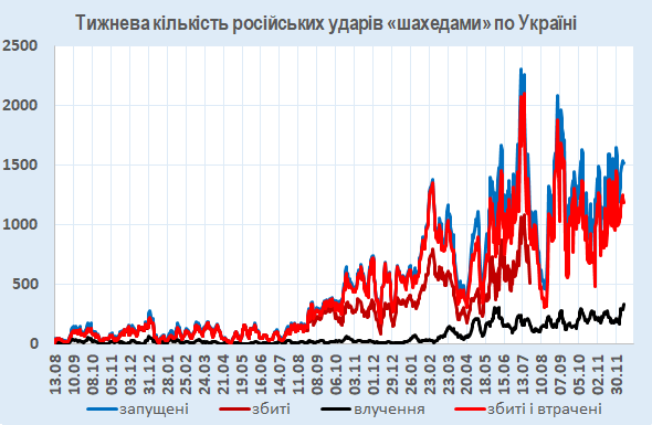 За минулі сім днів було збито чи локаційно втрачено 1188 із 1521 запущених по Україні БпЛА (разом – 78%).