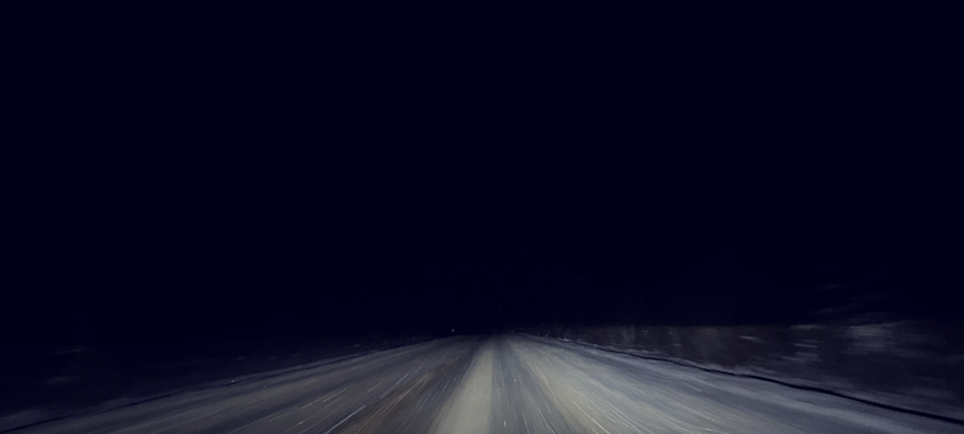 Те, що ми в’їхали в гірський кряж, стало зрозуміло одразу: температура падала, хмари зробилися темно-фіолетовими і починалася хурделиця. Запрацювали «двірники». Гори, вкриті хвойними деревами, прийняли на себе першу снігову атаку і біліли. З-під коліс обганяючих нас авт, летіла снігова потеруха, особливо від дальнобійних вантажівок. Попереджувальні написи на електронних табло, що час до часу траплялися, попереджували про небезпеку цієї ділянки. Сніг, що починався в Монреалі, вирішив нас наздогнати й показати свою надприродну силу. По лобовому склі сікло протягом двох годин. Ми то долали пагорби, то знову з’їджали вдолину. Дорога нагадувала синусоїдну криву: гора – діл. Атмосферний тиск тиснув у скроні. І все ж білосніжні видива викликали не тільки тривожні відчуття, але й здивування. Ми їхали назустріч снігові, й він супроводжував нас – такий білий, важкий і волохатий, що не поміщався у коротке слово «сніг», бо був всеоб’ємним і всюдисущним.