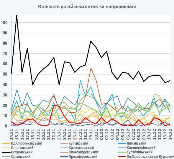 • В ніч з 12 на 13 грудня російські війська випустили по Україні 495 ракет і безпілотників, націлених переважно на енергетичну інфраструктуру по всій країні.