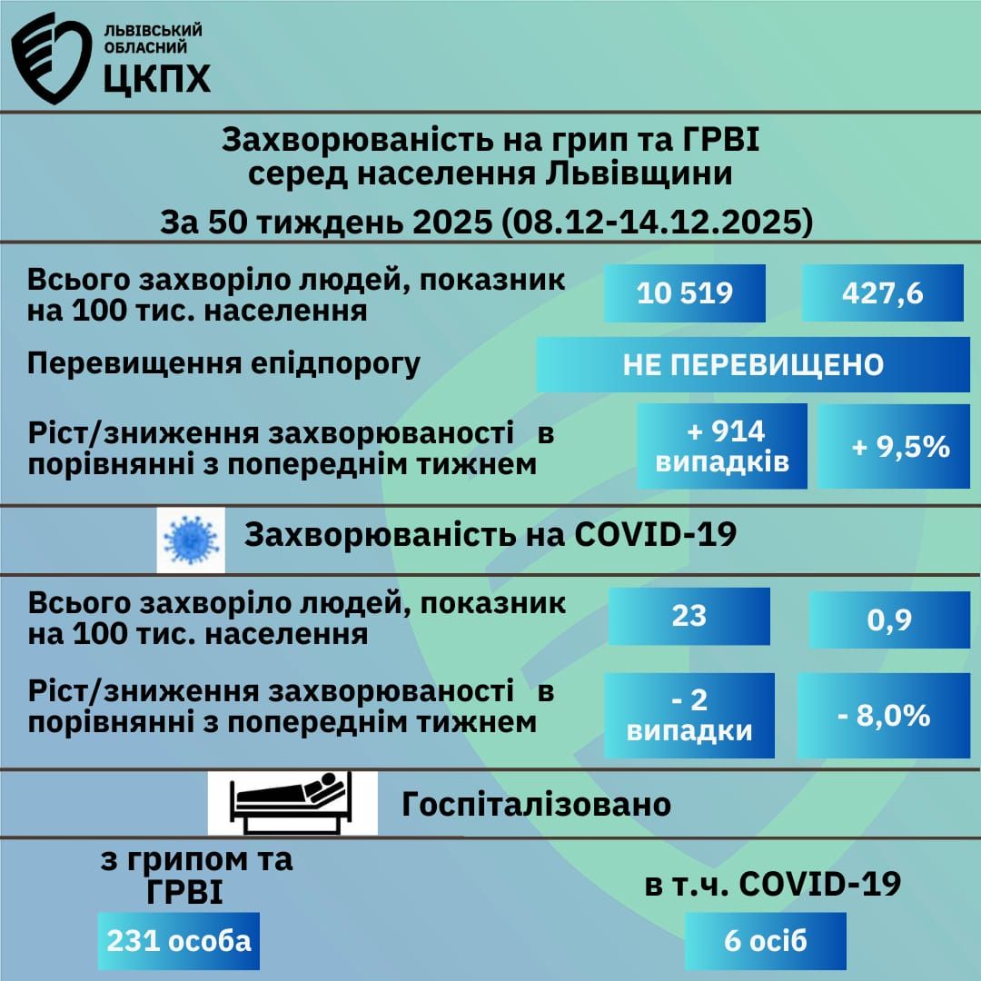 На Львівщині зросла захворюваність на грип: за тиждень від 8 до 14 грудня занедужало на 914 людей більше, ніж за тиждень перед тим. Таким чином кількість хворих на хрип в області зросла до 10919 людей. Втім, епідеміологічний поріг наразі ще не перевищено. Про це повідомила на своїй fb-сторінці гендиректорка Львівського обласного центру контролю та профілактики хвороб Наталія Іванченко.
