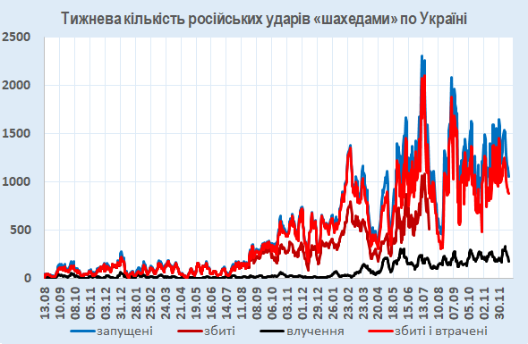 За минулі сім днів було збито чи локаційно втрачено 881 із 1056 запущених по Україні БпЛА (разом – 83%).