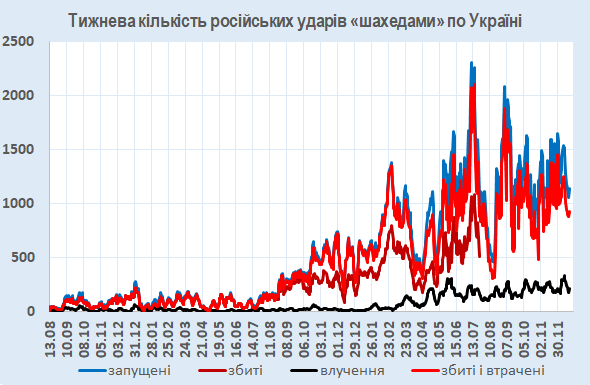 За минулі сім днів було збито чи локаційно втрачено 925 із 1136 запущених по Україні БпЛА (разом – 81%).