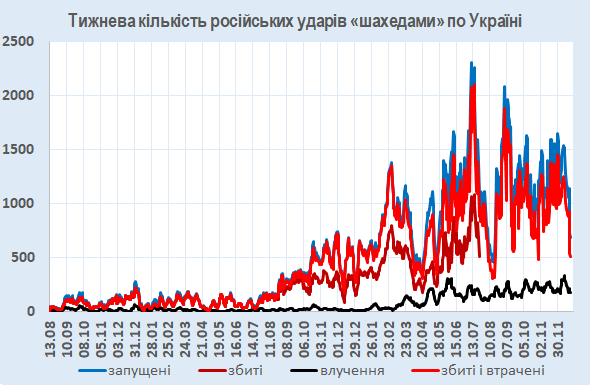 За минулі сім днів було збито чи локаційно втрачено 504 із 681 запущених по Україні БпЛА (разом – 74%).