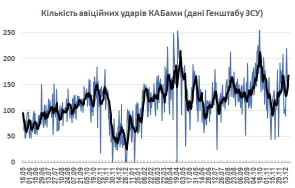 12:55 Протягом минулого тижня російська армія застосувала проти України 1171 кореговану авіаційну бомбу, що більше, ніж попереднього тижня (було 913), випливає зі щоденних повідомлень Генштабу ЗСУ.