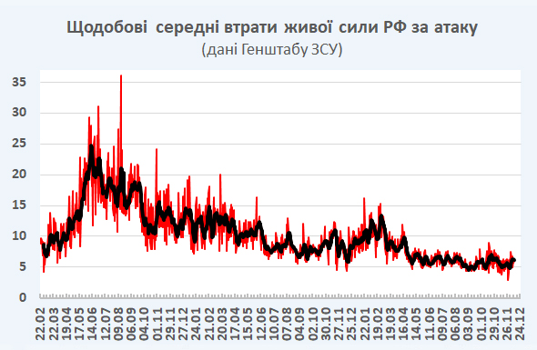 13:00 За минулий тиждень, за зведеннями Генштабу ЗСУ, було відбито 1314 російських атак (позаминулого тижня – 1230), при цьому знищено 8250 російських військових (позаминулого – 7620): у середньому 6,3 за атаку (позаминулого – 6,2).