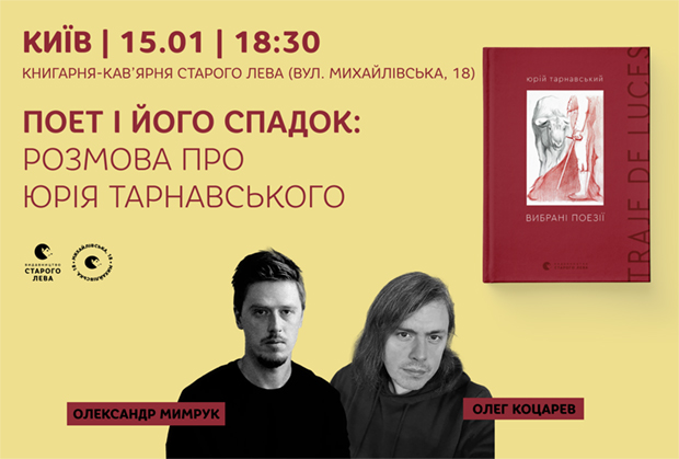 Видавництво Старого Лева запрошує провести вечір, присвячений Юрію Тарнавському, у товаристві поетів Олександра Мимрука та Олега Коцарева. Але також в певному сенсі й у присутності самого автора — через його тексти, їх читання й обговорення. Через той літературний спадок, який він залишив та про який ітиме мова.