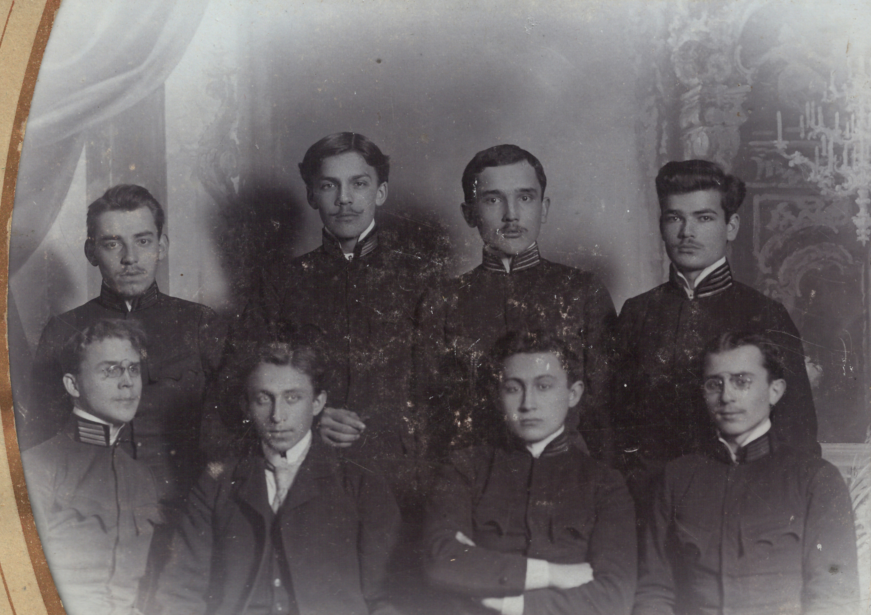 Вокальний ансамбль учнів VIII класу української гімназії у Перемишлі, 1904 р. Сидять зліва направо: Іван Гонтарський (баритон), диригент (прізвище невідоме), невідомий, Володимир Ґмитрасевич (ІІ тенор); стоять зліва направо: невідомий, Теодор Пасічинський (І тенор), невідомий, Пантелеймон Шпилька. Фото із родинного альбому Дмитрасевичів. Копія – Народний музей історії м. Судова Вишня.