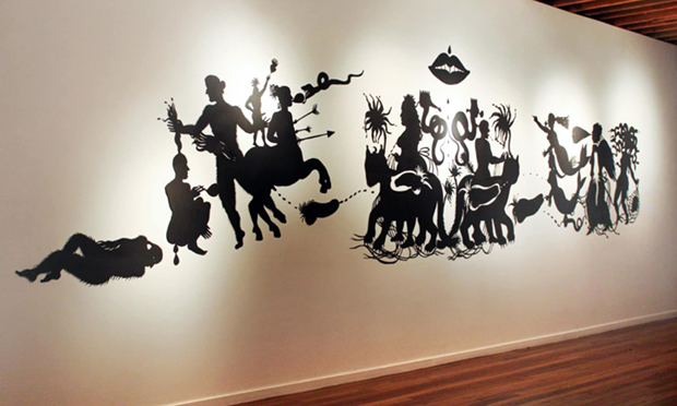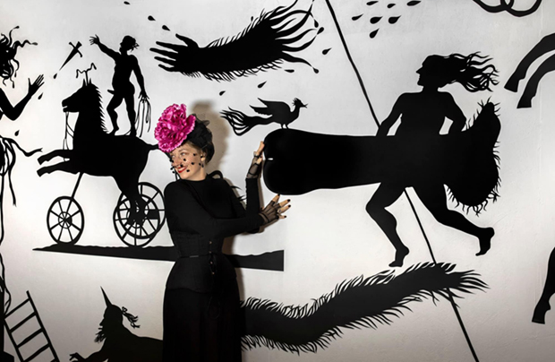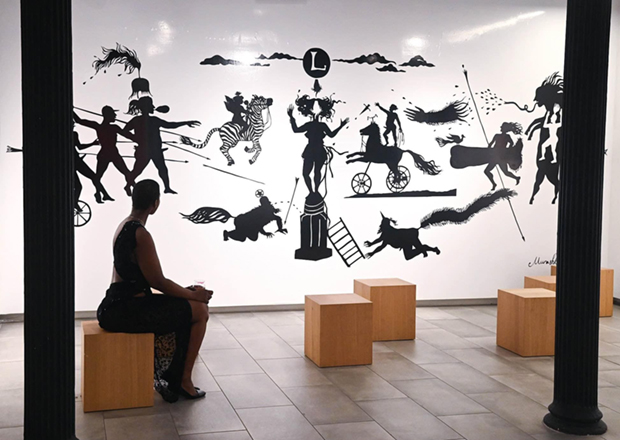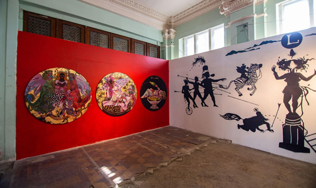 "Lysistrata" - фото проекту з Харківської бієнале молодого мистецтва, 2019. Живопис та силуетна композицiя, вирiзана з паперу.