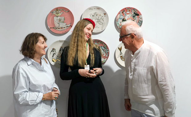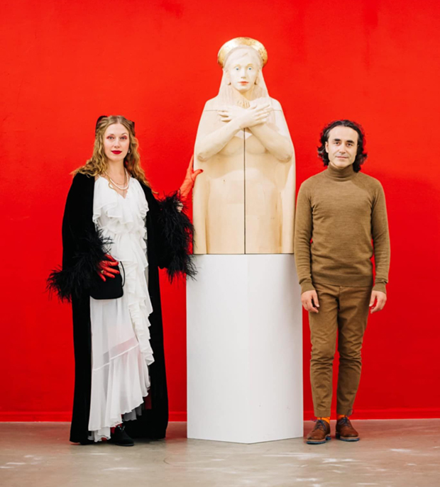 Ніна Мурашкіна з чоловіком, скульптором Xavier Escala на дуетній виставцi «Жінка та чоловік» в галереї «Лавра» Тетяни Мiронової, Київ, 2021 р.