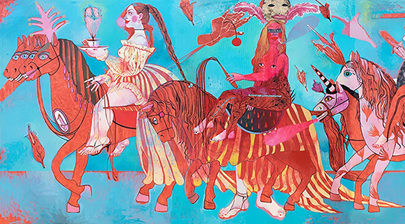 "Conquistadoras" - 2024, 200 x 450 cm, acrylic, ink, golden leaf, canvas.